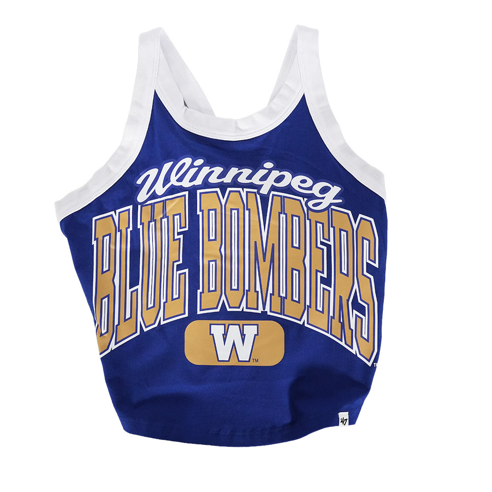 has been added to your shopping cartA loud crop tank top to rock while cheering on your Winnipeg Blue Bombers! With the script lettering above a block Blue Bombers, this creates a very cute and bold effect that resembled the proud Bombers fans, cheering on for a long rally.